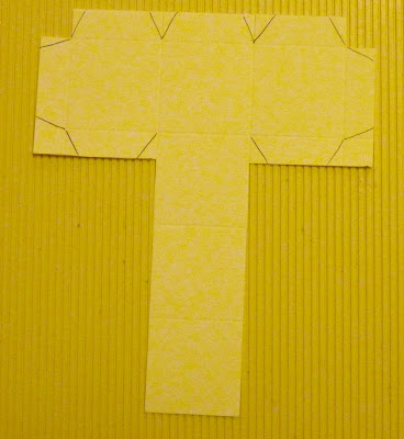 You should then be left with this shape. You now need to cut away the portions shown on the above photo. NOTE! you are not removing the whole scored squares, mark approx 1/2 " as shown to create some tabs.