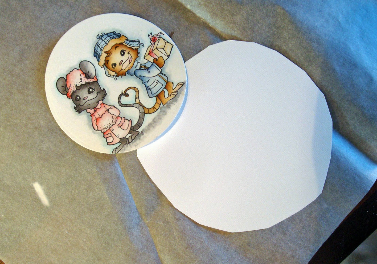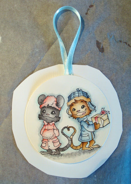 I started off with chosing which stamp to use (it´s so hard, sooo many beauties to pick from ;)) Decided to use Betty and Henri wintermice. Continue by inking it and use an appropriate die to cut out the image.