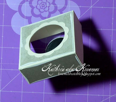 Cover both, the square and the strip of cardstock with some patterned paper. It´s enough to cover only two opposite sides of the box since the other ones will be covered from the cardstock strip.