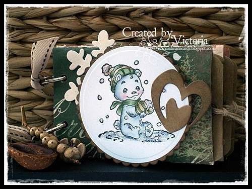 This is the finished product when decorated. I used the adorable Cute Snowman that I stamped onto white cardstock using memento tuxedo black ink. I have colored him with various copic markers that I then layered on to a scallop circle. My ribbon is tied around the bottom with some silver cord and a few little bells.