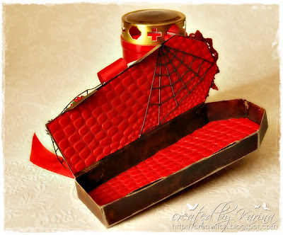 Afterwards I gave the cuffin a used look with dab some dark brown acrylic paint onto the cardstock. I distressed the edges with a brilliance pearlescent ink pad. Afterdrying I glued the coffin together.